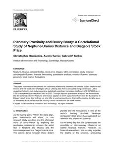 User prompt: Please provide potential search keywords for a paper titled Planetary Proximity and Boozy Booty: A Correlational Study of Neptune-Uranus Distance and Diageo's Stock Price with an abstract of This paper explores the unexpected yet captivating relationship between the celestial bodies Neptune and Uranus and the stock price of Diageo (DEO). Utilizing data from Caclculated using Astropy and LSEG Analytics (Refinitiv), our study presents a statistically significant correlation coefficient of 0.9373353 at p < 0.01 for the period spanning from 2002 to 2023. Through rigorous quantitative analysis, we demonstrate that the distance between Neptune and Uranus appears to exert a peculiar influence on the fluctuations in Diageo's stock price. Our findings not only offer a novel perspective on financial forecasting but also leave us wondering if the planets may be pouring cosmic cocktails into the stock market.