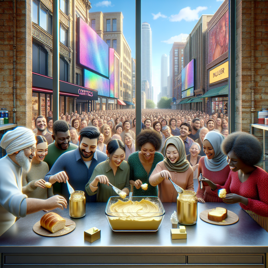 Prompt: Generate an image of a hyper-realistic kitchen scene where people are joyfully spreading lavish amounts of butter on soft, freshly-baked bread. In the background, through the window, a line of individuals eagerly glance at their reflections in the storefront windows of an Ulta Beauty store. An electronic board prominently displays the steady upward climb of the ULTA stock price. The depiction should include only scenes, people, and objects, it should not include text or speech bubbles.