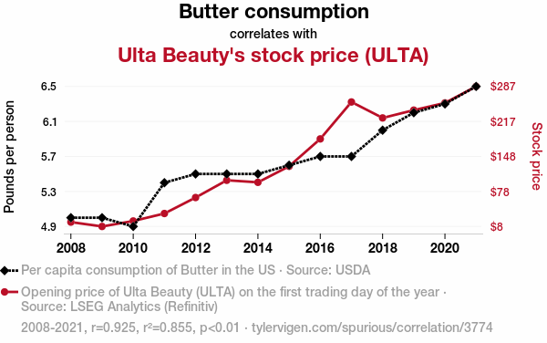 butter consumption, Ulta Beauty stock price, finance, correlation coefficient, traditional financial analysis, dairy products, stock market, investment strategies, financial forecasting, USDA data, LSEG Analytics, Refinitiv, butter consumption and stock prices