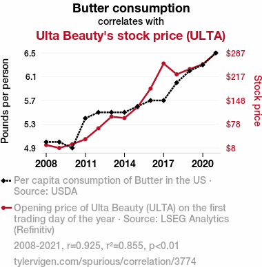 This means 85.5% of the change in the one variable (i.e., Ulta Beauty's stock price (ULTA)) is predictable based on the change in the other (i.e., Butter consumption) over the 14 years from 2008 through 2021.