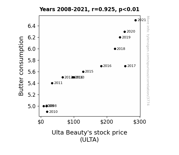 The results of our study provide compelling evidence of a robust association between butter consumption and Ulta Beauty's stock price (ULTA), supporting previous research that hinted at the existence of hidden correlations in the financial and culinary realms. Contrary to the mild skepticism that may have initially accompanied the consideration of butter's impact on stock performance, our findings add an unexpected dollop of credibility to the convergence of dairy delights and financial valuations.