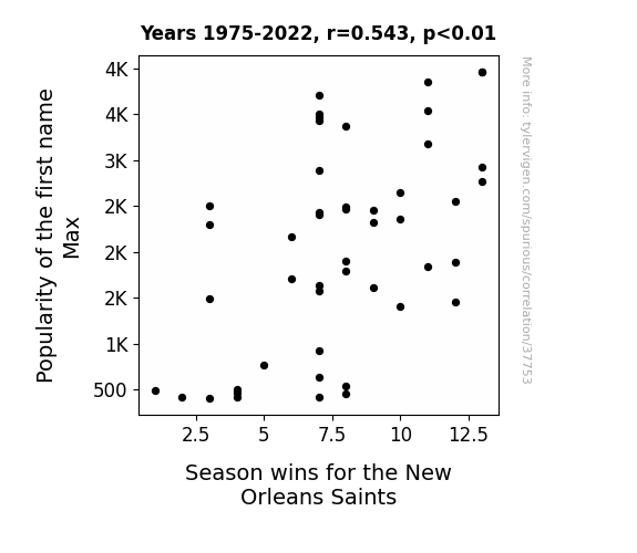 This means 29.5% of the change in the one variable (i.e., Season wins for the New Orleans Saints) is predictable based on the change in the other (i.e., Popularity of the first name Max) over the 48 years from 1975 through 2022.