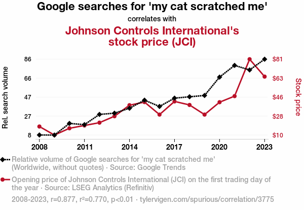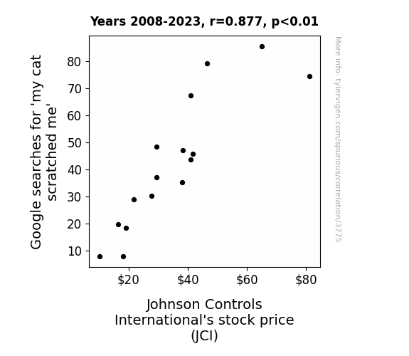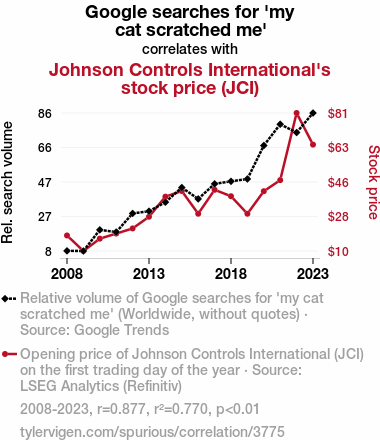 - The spurious research paper: Scratch That Stock: The Purr-fect Relationship Between Google Searches for 'My Cat Scratched Me' and Johnson Controls International's Stock Price
