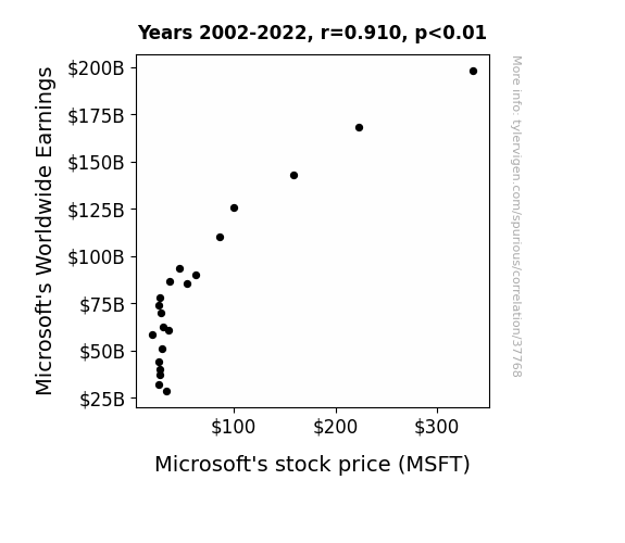 This means 82.8% of the change in the one variable (i.e., Microsoft's stock price (MSFT)) is predictable based on the change in the other (i.e., Microsoft's Worldwide Earnings) over the 21 years from 2002 through 2022.