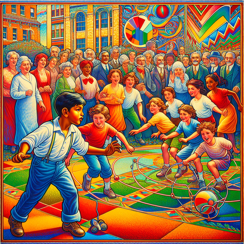 User prompt: Please respond with an image generation prompt that would be likely to create an interesting visual using DALLE-3, using the following style: [ Pop art ] and depicting this scene: A playground buzzes with children as Sonny is called out to join the game, his name echoing loudly. Nearby, a stock ticker displays Edwards Lifesciences' rising stock price, reflecting the surge in investments. In the background, a group of grandparents watches the children play, feeling the warmth of their grandchildren's love as they witness their joy. Keep the visual depiction simple. Do not include any words or speech bubbles.