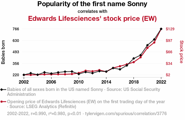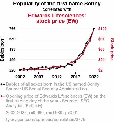 - The spurious research paper: The Sonny Side Up: A Correlational Study of the Name Sonny and Edwards Lifesciences' Stock Price
