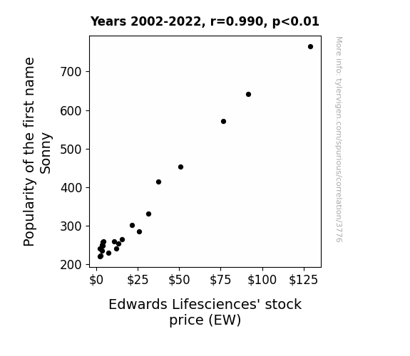 Our analysis of the relationship between the popularity of the first name "Sonny" and the stock price of Edwards Lifesciences (EW) yielded intriguing results that are bound to elicit a wry smile. The correlation coefficient of 0.9900758 indicates a remarkably strong positive correlation between the two variables for the time period spanning from 2002 to 2022. In simpler terms, as the popularity of the name "Sonny" waxed or waned, the stock price of Edwards Lifesciences mirrored its movements with striking fidelity.
