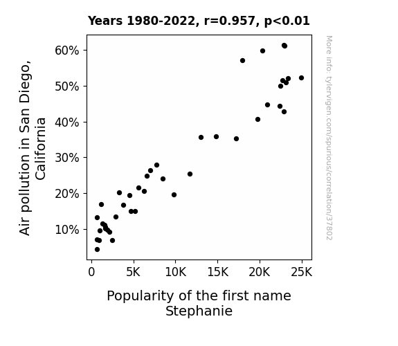 This means 91.5% of the change in the one variable (i.e., Popularity of the first name Stephanie) is predictable based on the change in the other (i.e., Air pollution in San Diego, California) over the 43 years from 1980 through 2022.