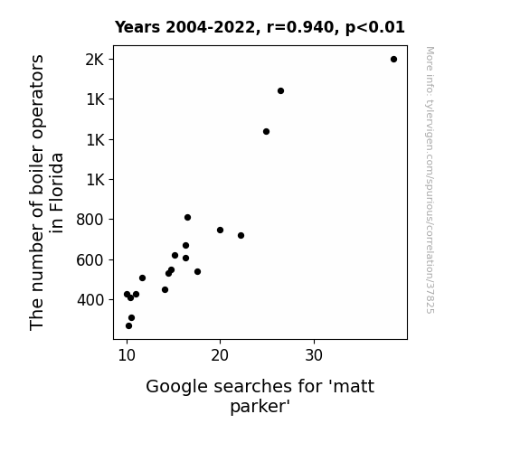 This means 88.3% of the change in the one variable (i.e., Google searches for 'matt parker') is predictable based on the change in the other (i.e., The number of boiler operators in Florida) over the 19 years from 2004 through 2022.