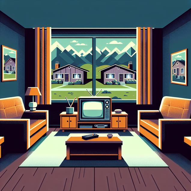 Prompt: "Create an image inspired by bauhaus depicting a cozy living room in Montana. A television blares the latest episode of 'Days of Our Lives,' with the remote control missing. Meanwhile, outside, a row of houses stands secure and untouched, with no sign of any burglaries." The depiction should include only scenes, people, and objects, it should not include text or speech bubbles.