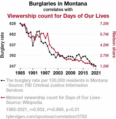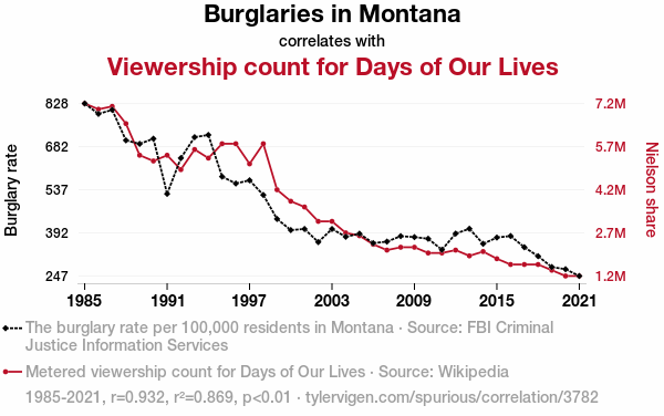 "burglaries in Montana, viewership of Days of Our Lives, empirical study, correlation coefficient, FBI Criminal Justice Information Services, Wikipedia, soap opera viewership, regional crime rates, statistical quirks, unusual interrelationships"