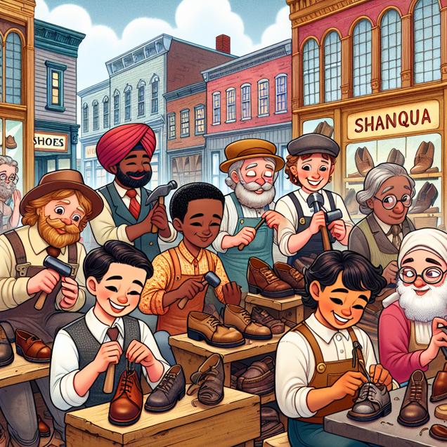 ChatGPT: [ Cute cartoon ] Create a charming illustration of a quaint Maine town featuring a busy street filled with cobblers and shoemakers. Show a variety of adorable cartoon characters hammering and stitching away at leather shoes while surrounded by vintage storefronts. Perhaps include a playful touch by adding a few worn leather shoes with the name "Shaniqua" on display in the shop windows. As an extra detail, showcase the evolution of the town, with younger characters showing interest in revitalizing the once popular trend, sparking a resurgence in the art of cobbling and the lively sounds of their craft.