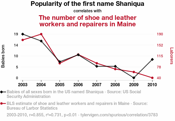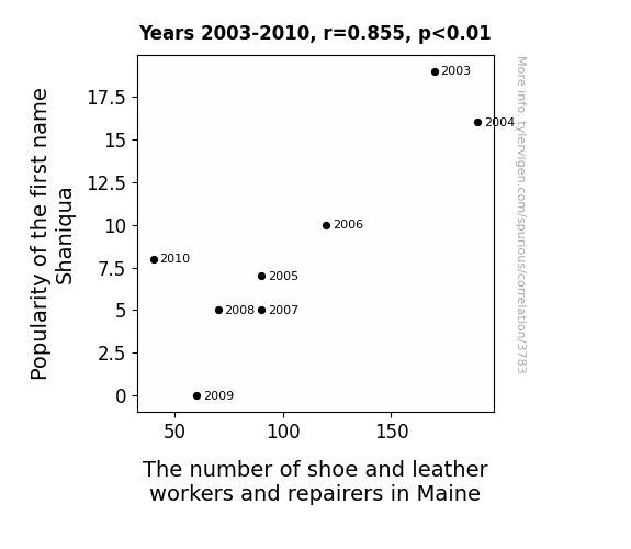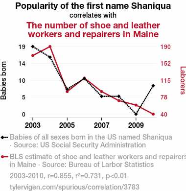 - The spurious research paper: Shoe-niqua and the Cobbler Connection: An Empirical Study of the Relationship between the Popularity of the Name Shaniqua and the Number of Shoe and Leather Workers and Repairers in Maine