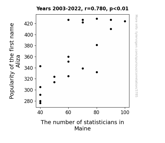 - The spurious research paper: The Aliza Effect: Exploring the Curious Correlation Between the Popularity of the Name Aliza and the Number of Statisticians in Maine