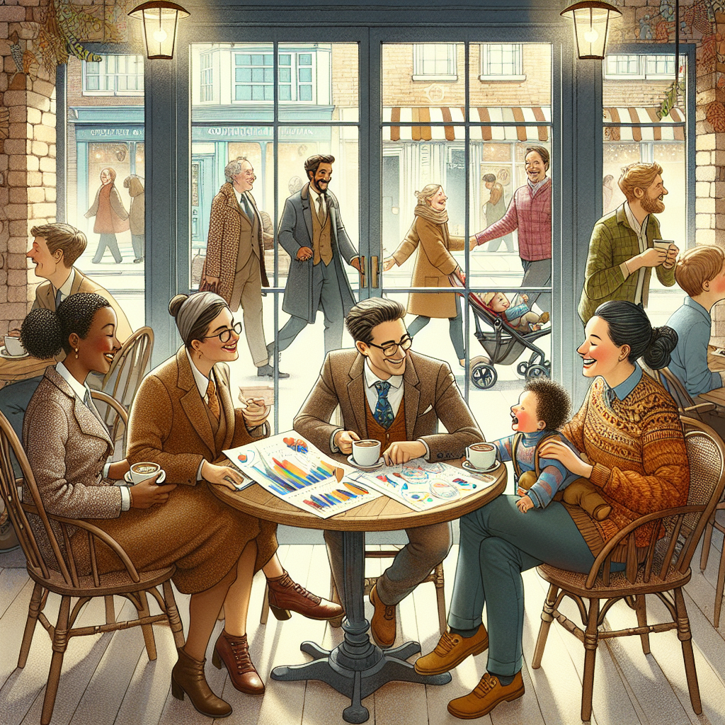 Prompt: [ Whimsical illustration ] Create an image of a cozy coffee shop interior, with warm lighting and a rustic decor. A group of friendly statisticians, dressed in tweed and cozy sweaters, are gathered around a table covered in data charts and graphs. They are engaged in a lively discussion, gesturing and analyzing the data with fascination. Meanwhile, outside the coffee shop, a cheerful group of parents can be seen strolling with their little ones, calling out the name "Aliza" with delight. The children, filled with joy, giggle and skip alongside their parents. The image captures the cozy atmosphere inside the coffee shop and the joyful scene outside, with a subtle touch of statistical whimsy. The depiction should include only scenes, people, and objects, it should not include text or speech bubbles.