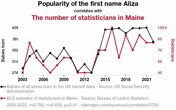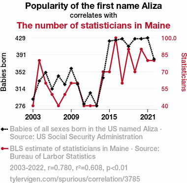 - The spurious research paper: The Aliza Effect: Exploring the Curious Correlation Between the Popularity of the Name Aliza and the Number of Statisticians in Maine