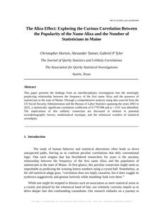 The Aliza Effect: Exploring the Curious Correlation Between the Popularity of the Name Aliza and the Number of Statisticians in Maine The Journal of Quirky Statistics and Unlikely Correlations Jan 2024 Reminder: This paper is AI-generated. Not real! |