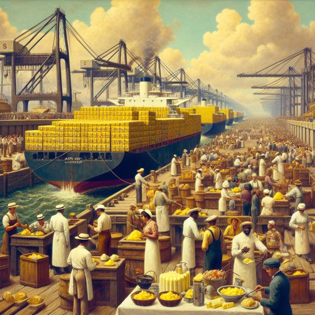 Prompt: Generate an image of a bustling Texan port, with cargo ships loaded with crates of butter sailing in from afar. Show the dock lined with an increased number of bridge and lock tenders, working tirelessly to operate the systems and accommodate the influx of butter-laden cargo ships. The air should be filled with the rich scent of butter as chefs in nearby restaurants prepare delicious, butter-drenched dishes to meet the heightened demand. The overall scene should convey the vibrant energy and activity of the port during this unique influx of butter shipments. The depiction should include only scenes, people, and objects, it should not include text or speech bubbles.