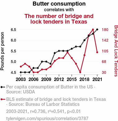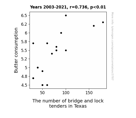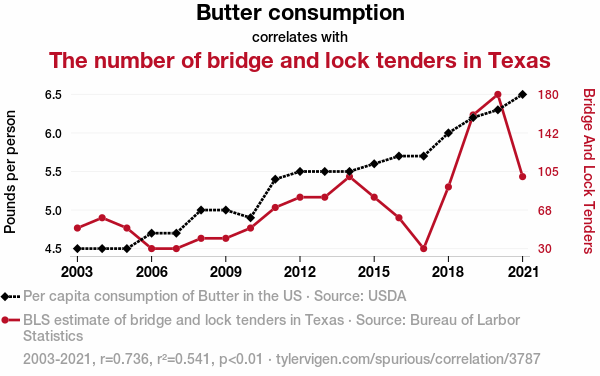 - The spurious research paper: Spreading Butter, Building Bridges: A Creamy Correlation Between Butter Consumption and the Number of Bridge and Lock Tenders in Texas