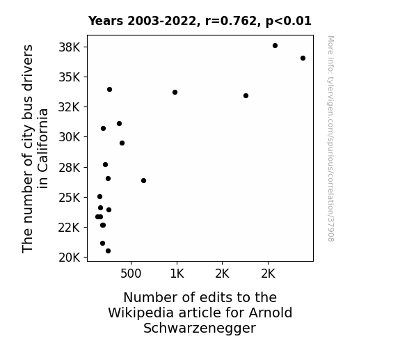 This means 58% of the change in the one variable (i.e., Number of edits to the Wikipedia article for Arnold Schwarzenegger) is predictable based on the change in the other (i.e., The number of city bus drivers in California) over the 20 years from 2003 through 2022.