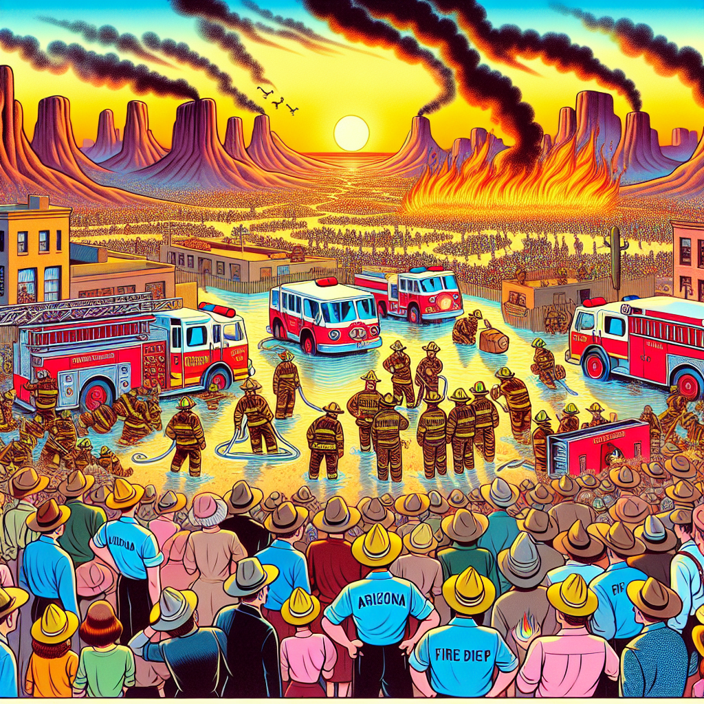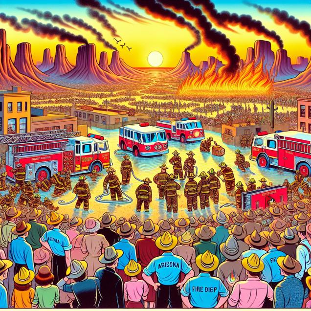 ChatGPT: [ Cute cartoon ] Create an image of a charming Arizona desert scene with a small fire flickering on the horizon as the sun sets. A group of adorable cartoon firefighters in colorful uniforms, emblazoned with the letters "AZFD", is seen quickly extinguishing the flames. Additionally, depict a bustling cartoon representation of the streets of Turkiye, where a crowd marvels at a team of cute, skilled firefighters containing a small kerosene-related fire. The locals cheer and applaud these lovable heroes as they proudly stand, showcasing their expertise and helping reduce kerosene usage in the community.