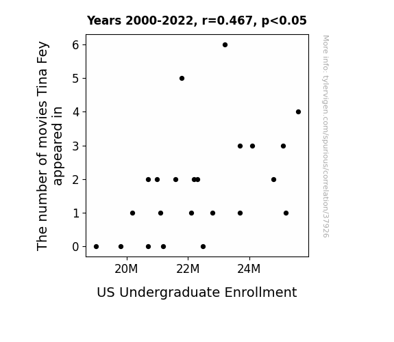 This means 21.8% of the change in the one variable (i.e., US Undergraduate Enrollment) is predictable based on the change in the other (i.e., The number of movies Tina Fey appeared in) over the 23 years from 2000 through 2022.