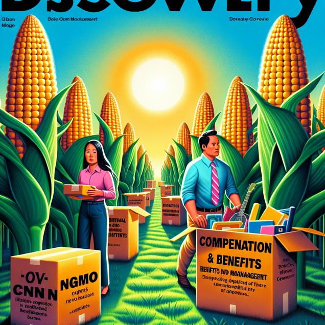 ChatGPT: Generate an image of a magazine cover with the title "Discovery" superimposed at the top. Illustrate a Michigan cornfield in the background, with tall, proud stalks of non-GMO corn standing vibrantly under the sun. The ears of corn should be plump and perfect, displaying the high quality of the crop. In the foreground, depict an office scene showing compensation and benefits managers packing up their belongings, looking disappointed as they 'stalk' away due to the decrease in workload caused by the excellent quality of the corn.