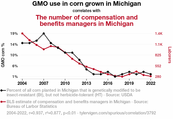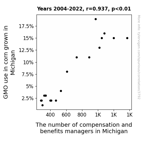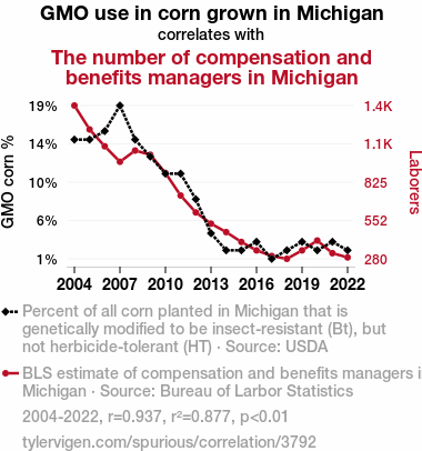 This means 87.7% of the change in the one variable (i.e., The number of compensation and benefits managers in Michigan) is predictable based on the change in the other (i.e., GMO use in corn grown in Michigan) over the 19 years from 2004 through 2022.