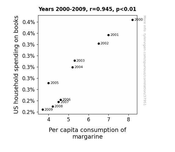 This means 89.3% of the change in the one variable (i.e., Per capita consumption of margarine) is predictable based on the change in the other (i.e., US household spending on books) over the 10 years from 2000 through 2009.