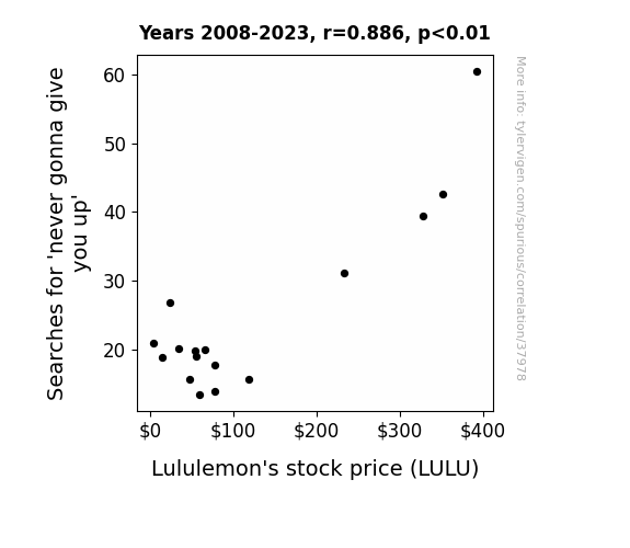 This means 78.6% of the change in the one variable (i.e., Lululemon's stock price (LULU)) is predictable based on the change in the other (i.e., Searches for 'never gonna give you up') over the 16 years from 2008 through 2023.