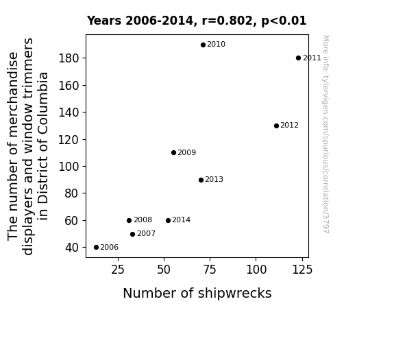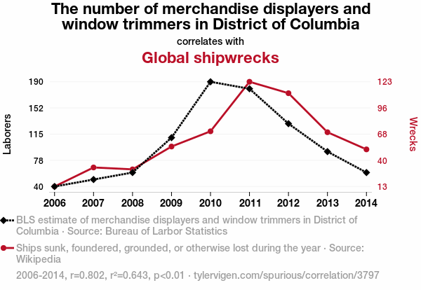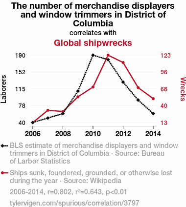 merchandise displayers, window trimmers, District of Columbia, global shipwrecks, correlation, Bureau of Labor Statistics, Wikipedia, correlation coefficient, statistical significance, storefront aesthetics, maritime mishaps, commerce and calamity, research community, unexpected linkage