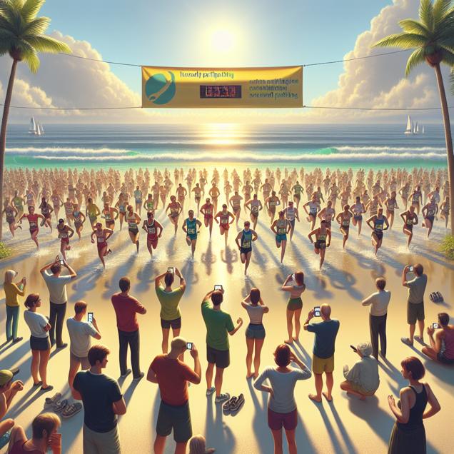 Prompt: Prompt: [ A photo-realistic image ] Set on a radiant Florida beach, capture a vibrant scene where numerous athletes and sports competitors are assembled in preparation for a marathon. The beach is bathed in golden sunlight, with the runners stretching and warming up against a backdrop of gently rolling waves and clear blue skies. An unmistakable aura of excitement and anticipation envelops the scene as people gather to witness the event. Notably, amidst the poised competitors and spectators, depict a noticeable surge of individuals using their smartphones to search for 'zombies', their expressions reflecting a mix of puzzlement and concern. As they engage with their devices, subtly convey the presence of a prominent banner in the background, proudly showcasing the growing number of athletes and sports competitors in Florida. Capture the convergence of these intriguing elements within a simple and captivating composition. The depiction should include only scenes, people, and objects, it should not include text or speech bubbles.