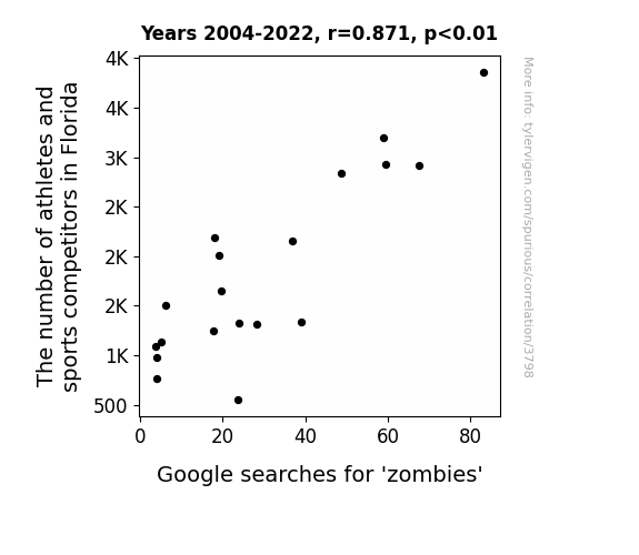 It's time to lace up our sneakers and limber up our funny bones because we're about to embark on a journey into the strange and captivating world of correlations. Here, we're not just talking about the usual suspects like the relationship between inflation and unemployment or the supply and demand of goods and services. No, we're diving headfirst into the murky waters of unexpectedly related phenomena - and in this case, that includes athletes and Google searches for 'zombies' in the great state of Florida.