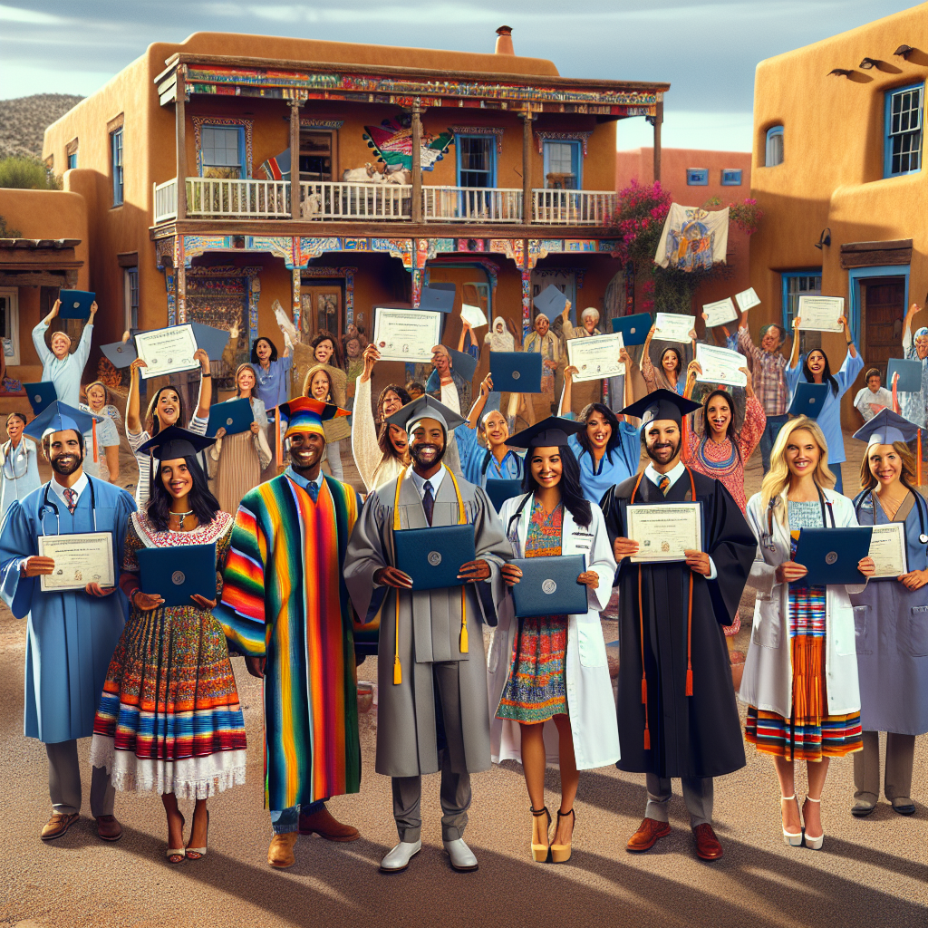 Prompt: An image that looks like it is a scene from A Disney Movie, depicting a bustling city in New Mexico. A group of people proudly hold their Associates degrees in Architecture and Related Services, smiling as they showcase their certificates. Meanwhile, a line of pediatricians can be seen stretched outside a tiny house, waiting to enter, as the shortage for pediatricians in New Mexico becomes evident. The scene is filled with vibrant colors and the architecture showcases unique southwestern influences. The people are dressed in a mix of modern and traditional clothing, adding to the cultural richness of the setting. The depiction should include only scenes, people, and objects, it should not include text or speech bubbles.