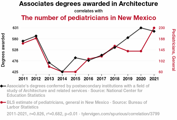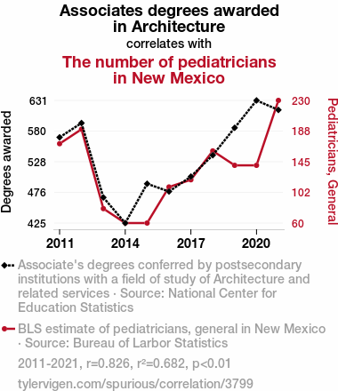 This means 68.2% of the change in the one variable (i.e., The number of pediatricians in New Mexico) is predictable based on the change in the other (i.e., Associates degrees awarded in Architecture) over the 11 years from 2011 through 2021.