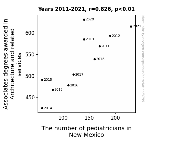 User prompt: Please make up a funny explanation for how an increase in Associates degrees awarded in Architecture and related services caused The number of pediatricians in New Mexico to increase.