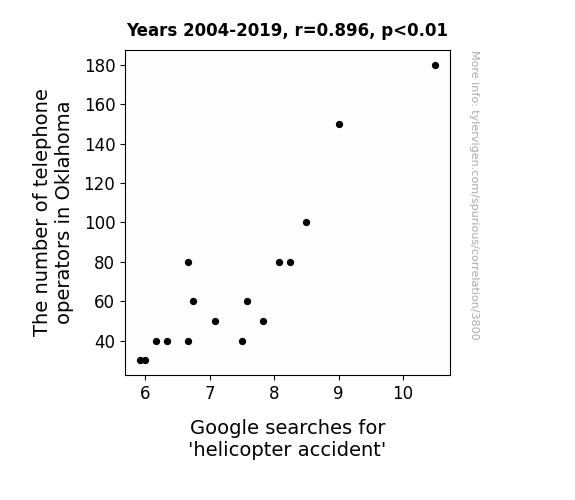 - The spurious research paper: Heli-calling for Help: Analyzing the Relationship Between Telephone Operators in Oklahoma and Google Searches for 'Helicopter Accident'