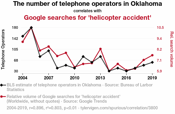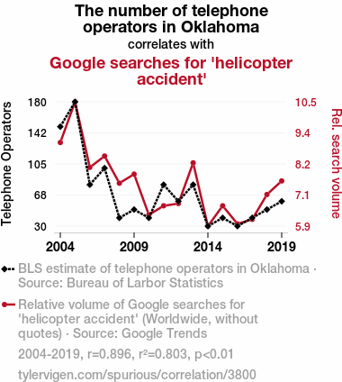 - The spurious research paper: Heli-calling for Help: Analyzing the Relationship Between Telephone Operators in Oklahoma and Google Searches for 'Helicopter Accident'
