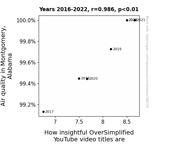 This means 97.2% of the change in the one variable (i.e., How insightful OverSimplified YouTube video titles are) is predictable based on the change in the other (i.e., Air quality in Montgomery, Alabama) over the 7 years from 2016 through 2022.