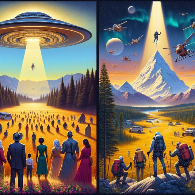 ChatGPT: Generate an image with the style of a Discovery magazine cover that showcases the following scene: In a dramatic Alabama landscape, a radiant UFO hovers above a tranquil field, casting an otherworldly glow. Onlookers below gaze up in awe at the mysterious craft. Simultaneously, a group of advanced-looking climbers, equipped with futuristic gear, easily conquer the summit of Mount Everest, leaving observers amazed by their seemingly effortless ascent. The focus should be on the juxtaposition of these awe-inspiring events in a simple yet visually captivating manner.