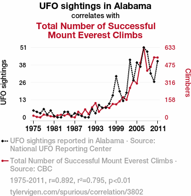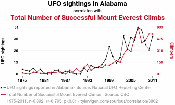 User prompt: Please provide potential search keywords for a paper titled UFO a Summit: A Statistical Analysis of the Relationship between UFO Sightings in Alabama and Total Number of Successful Mount Everest Climbs with an abstract of This paper presents a comprehensive statistical analysis of the potential connection between the frequency of UFO sightings in Alabama and the total number of successful Mount Everest climbs. Utilizing data from the National UFO Reporting Center and the CBC, our research team examined yearly occurrences from 1975 to 2011. Our findings revealed a striking correlation coefficient of 0.8915444 and a p-value of less than 0.01, suggesting a strong positive relationship between these seemingly unrelated phenomena. While the presence of extraterrestrial beings at the summit of Mount Everest may seem far-fetched, our results demand further investigation and reflection on the potential influence of interstellar activity on earthly feats. The implications of this research are as noteworthy as they are out of this world.