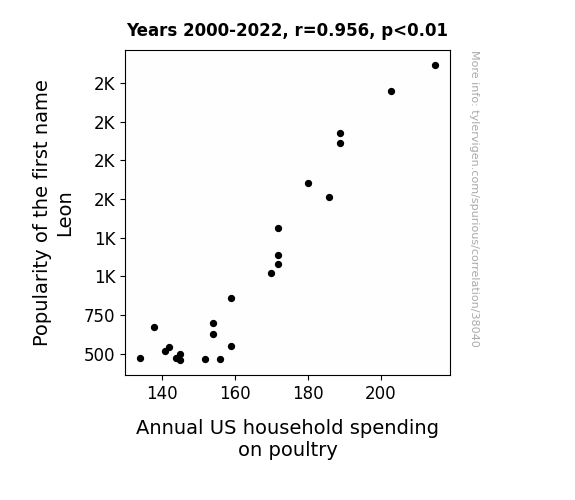 This means 91.4% of the change in the one variable (i.e., Annual US household spending on poultry) is predictable based on the change in the other (i.e., Popularity of the first name Leon) over the 23 years from 2000 through 2022.