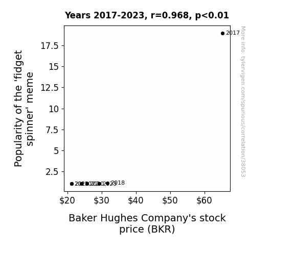 This means 93.8% of the change in the one variable (i.e., Baker Hughes Company's stock price (BKR)) is predictable based on the change in the other (i.e., Popularity of the 'fidget spinner' meme) over the 7 years from 2017 through 2023.