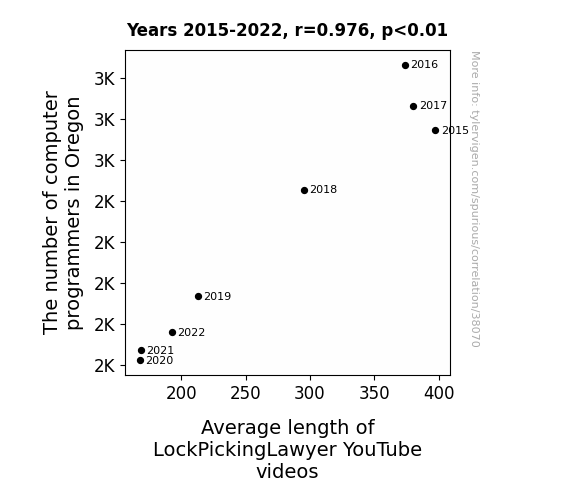 This means 95.3% of the change in the one variable (i.e., Average length of LockPickingLawyer YouTube videos) is predictable based on the change in the other (i.e., The number of computer programmers in Oregon) over the 8 years from 2015 through 2022.