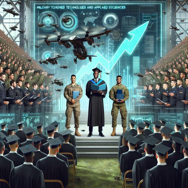 Prompt: Prompt: Generate an image in the style of data cyber art showing a bustling graduation ceremony. In the foreground, students in military uniforms proudly receive their Bachelor's degrees in Military Technologies and Applied Sciences. The graduation stage is surrounded by futuristic technological elements. In the background, an imposing stock ticker display shows Amazon.com's (AMZN) stock price surging, capturing the attention of the crowd and prompting excitement as they eagerly invest in the company pioneering drone delivery technology. The depiction should include only scenes, people, and objects, it should not include text or speech bubbles.