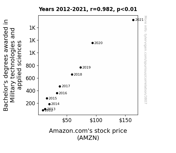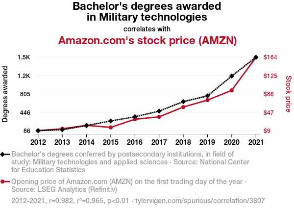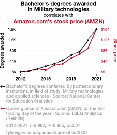 - The spurious research paper: The Tactical Tie: Tracing the Ties Between Bachelor's Degrees in Military Technologies and Amazon.com's AMZN Stock Price