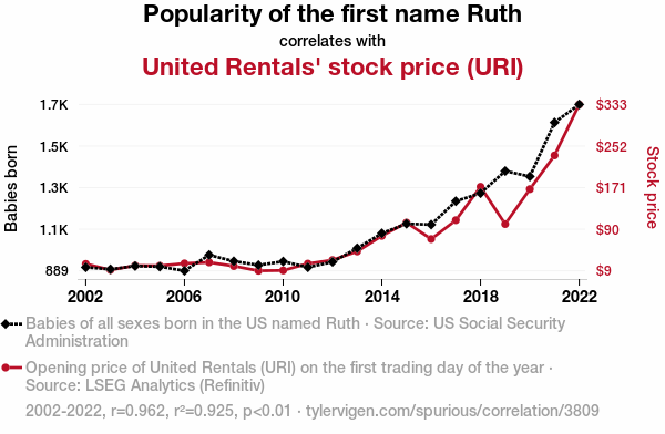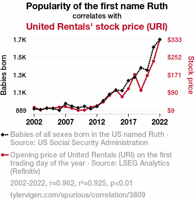 The influence of personal names on real-world outcomes has long been a topic of fascination and debate. In this study, we investigate the connection between the popularity of the first name Ruth and the stock price of United Rentals (URI). Drawing on extensive data from the US Social Security Administration and LSEG Analytics (Refinitiv), we meticulously examine the correlation between the two variables from 2002 to 2022. Our findings reveal a striking correlation coefficient of 0.9617038, indicating a robust relationship between the name Ruth and the stock price performance of URI.