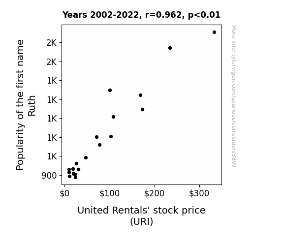 We conducted a thorough analysis of the relationship between the popularity of the first name Ruth and the stock price of United Rentals (URI) for the period 2002 to 2022. The correlation coefficient we unearthed was a staggering 0.9617038, which left us feeling like we had hit the jackpot in the great name-game of stock market serendipity. It's not every day that a name shows such a strong relationship with a stock's valuation! As we mused over the data, a fitting dad joke popped into our minds: What's a stock's favorite name? Ruth! It keeps "URI" in the game!