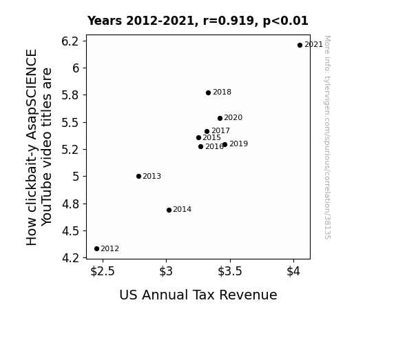 This means 84.5% of the change in the one variable (i.e., US Annual Tax Revenue) is predictable based on the change in the other (i.e., How clickbait-y AsapSCIENCE YouTube video titles are) over the 10 years from 2012 through 2021.