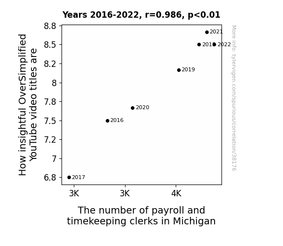 This means 97.3% of the change in the one variable (i.e., The number of payroll and timekeeping clerks in Michigan) is predictable based on the change in the other (i.e., How insightful OverSimplified YouTube video titles are) over the 7 years from 2016 through 2022.